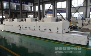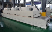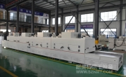 2、外形尺寸(約):總長8000*高1600*寬1200mm,進料部分長1000mm,加熱部分長6000mm(分3段溫區),收料部分長1000mm。輸送帶離地高700mm;